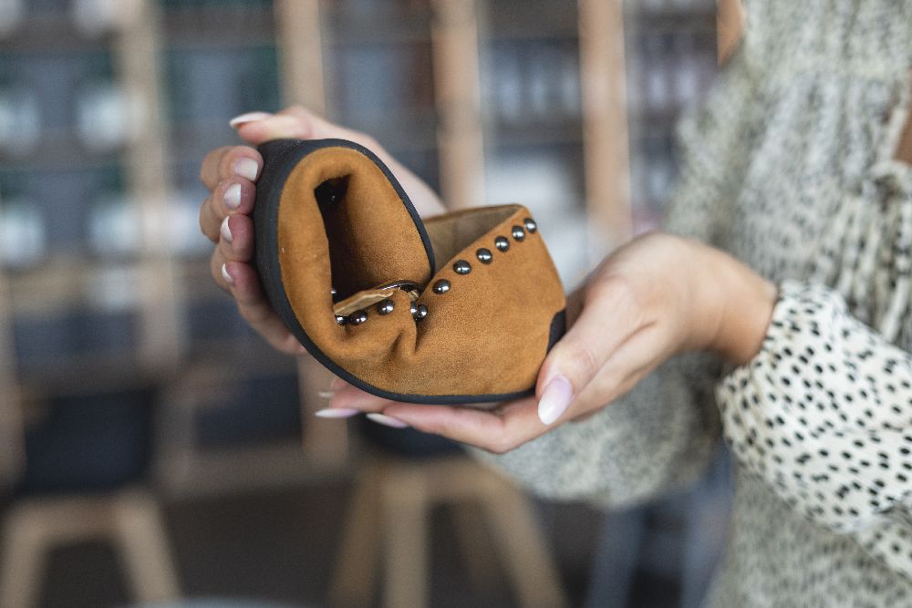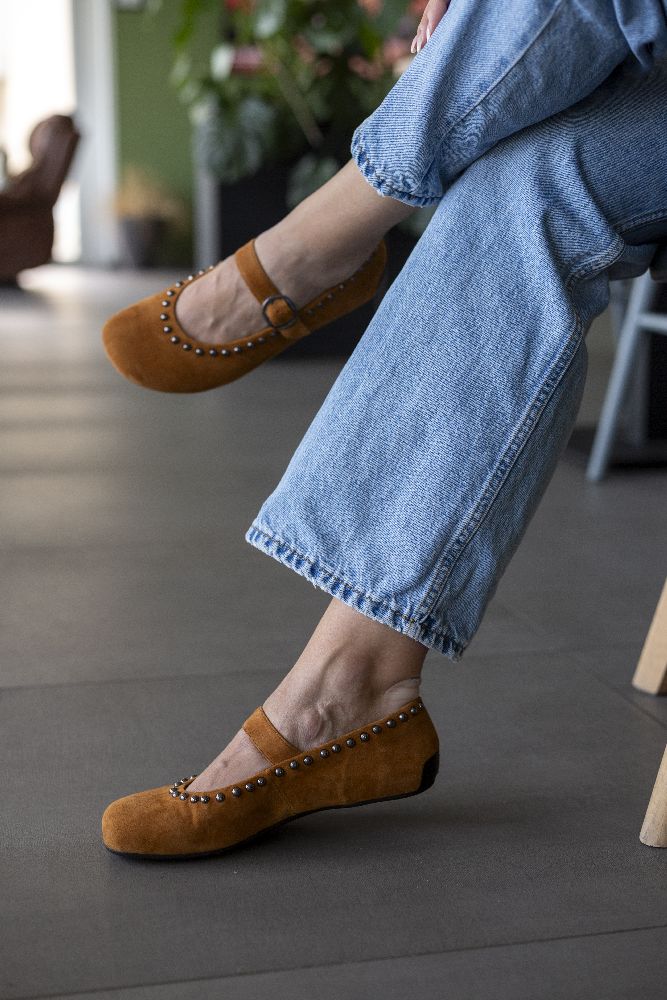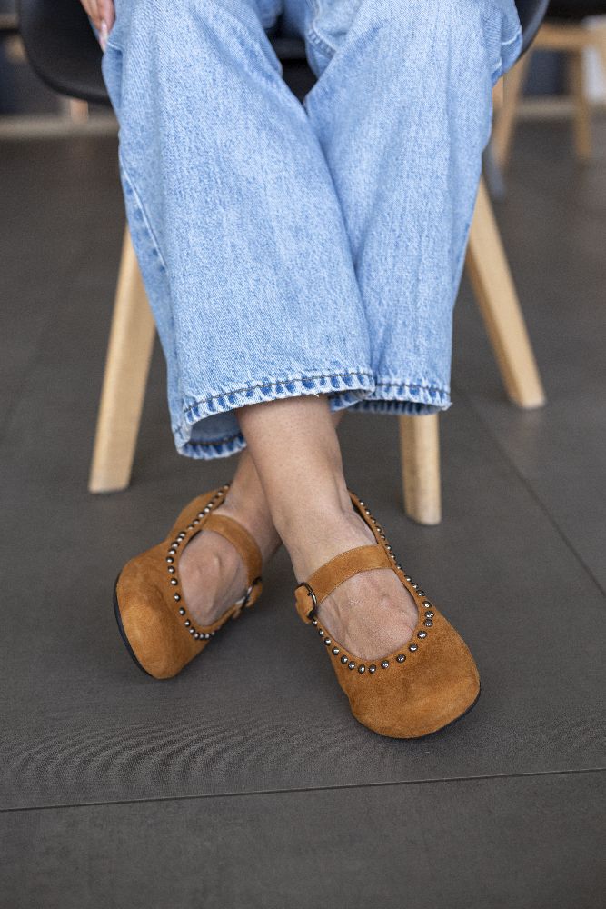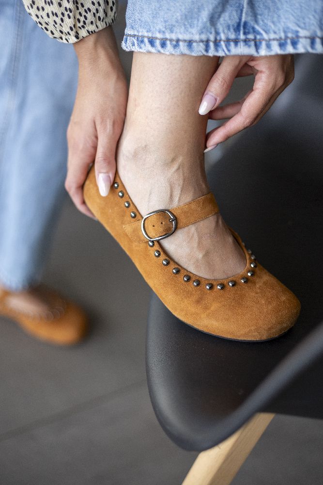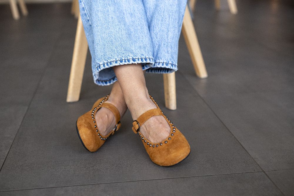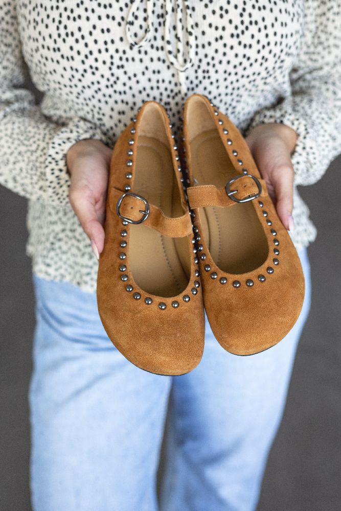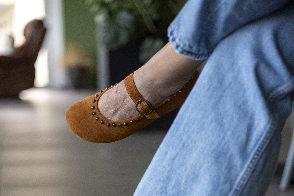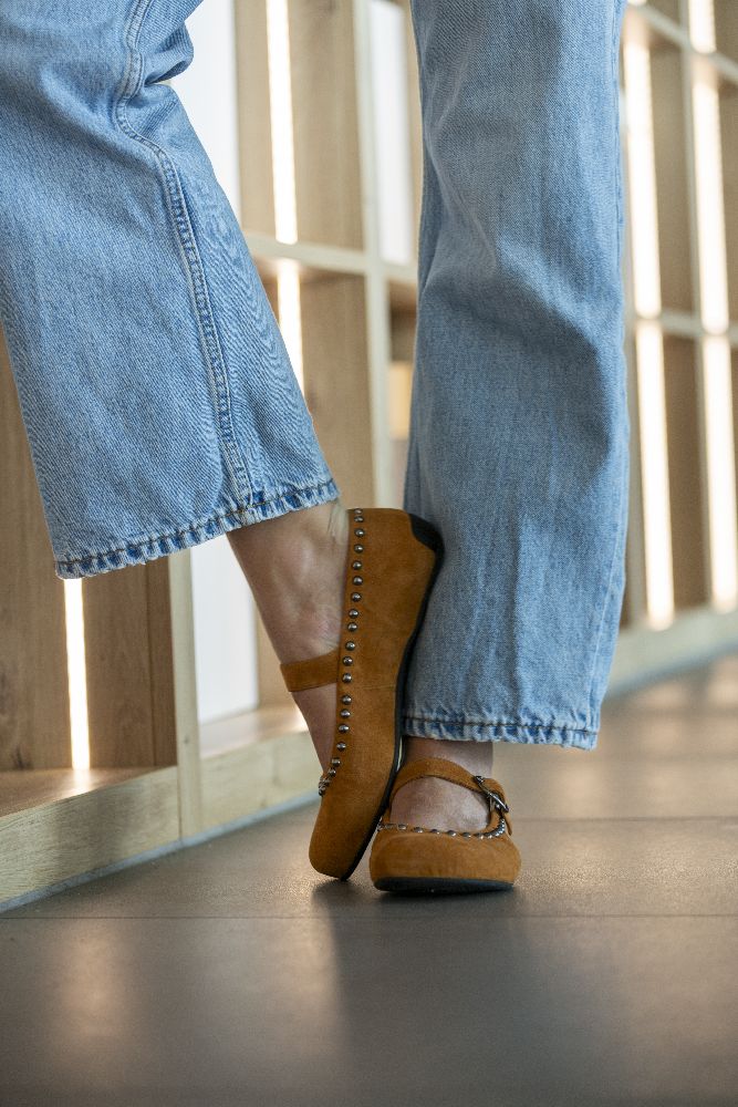 Nuestro Dieqo Brown es nuestro nuevo zapato Ballerin hecho de gamuza marrón. Esta pieza de joyería está bordeada de remaches redondos y le da a cada atuendo un toque de glamour, sin renunciar a la increíble comodidad a la que estás acostumbrado de nuestros zapatos descalzos.