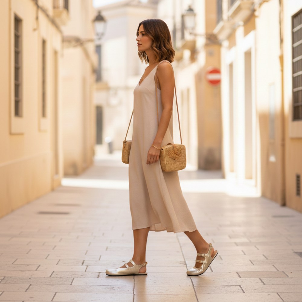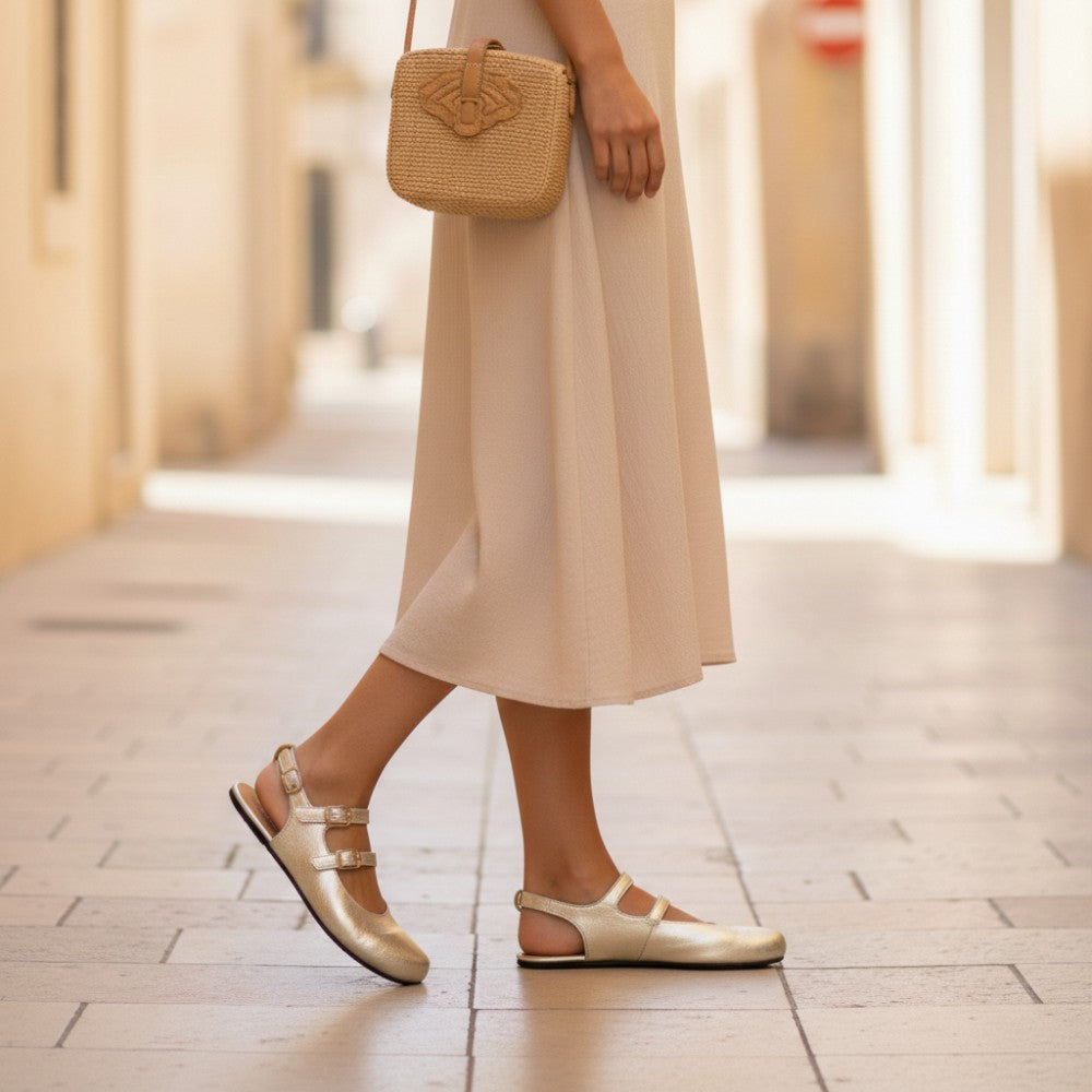 La suela flexible y el cuero de brillo suave se adaptan a sus movimientos. Esté activo todo el día sin un estilo anterior: nuestro Gold Qomeet lo hace posible. Úselo para su vestido de verano favorito o combínelo con pantalones fluidos y un top elegante para un aspecto elegante de la noche. El Gold de Qomeet también le da a tu atuendo un toque de glamour a los jeans y una camiseta simple. Es el compañero ideal para bodas, fiestas de jardín o simplemente por un día en la oficina si desea darle a su aspecto un acento especial.