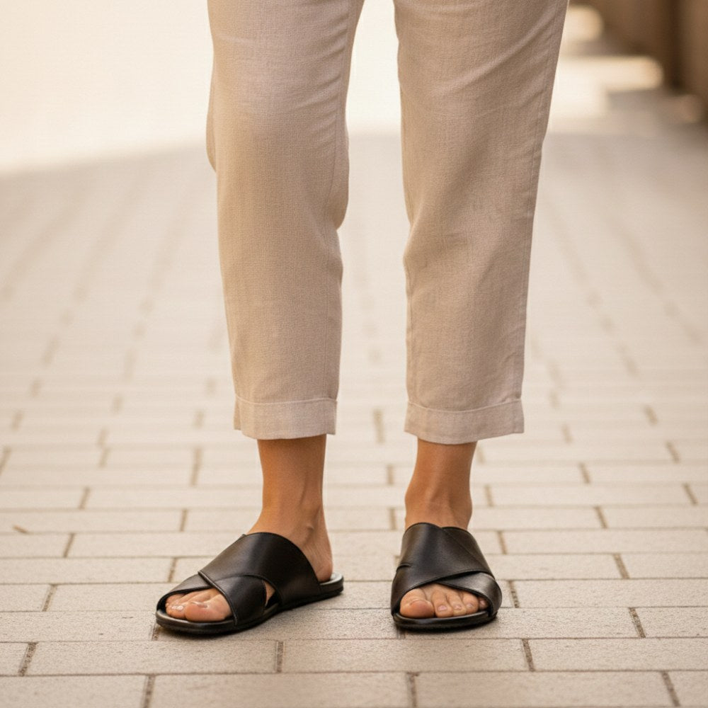 Con dos correas de cuero cruzadas que ofrecen la mejor parada, simplemente puede meterse en las sandalias negras de Manqa y disfrutar de su día al máximo. Sin hebillas, sin adornos, solo pura comodidad y libertad para tus pies. Estas sandalias combinan la ligereza de un zapato descalzo con la elegancia de un accesorio de moda.
