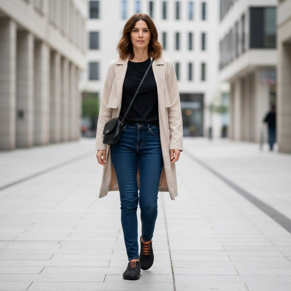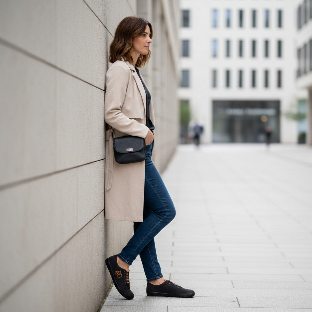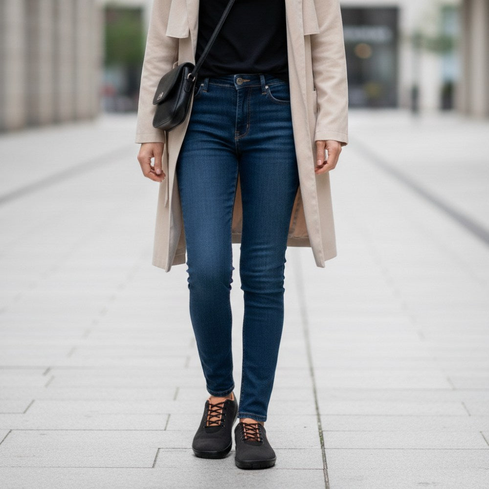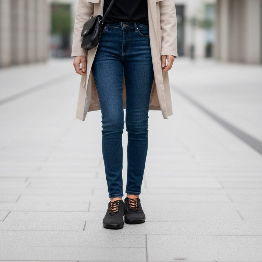 Qaro Black Orange es el compañero perfecto para los jeans. Con sus acentos naranja, esta zapatilla vegana descalza es algo muy especial sin bailar demasiado fuera de lugar.