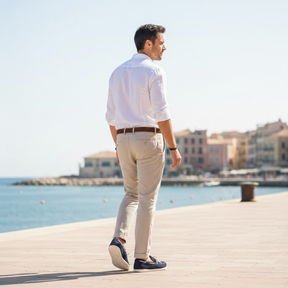 Los zapatos de botas azules QEA combinan encanto marítimo con comodidad descalzo, el compañero ideal para el hombre moderno.