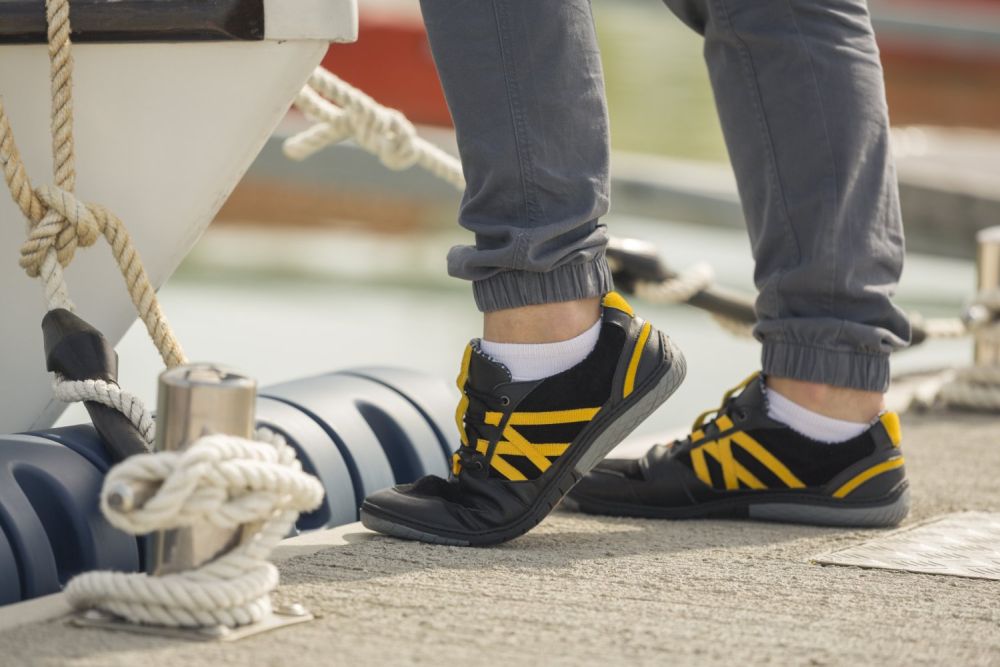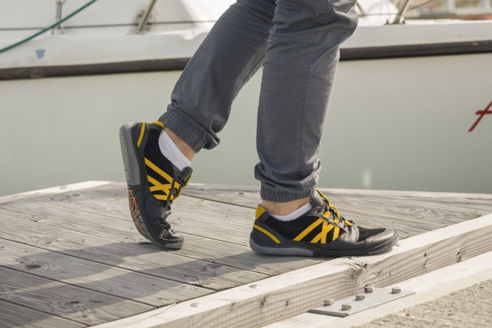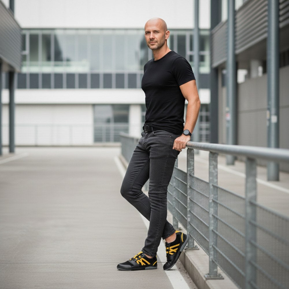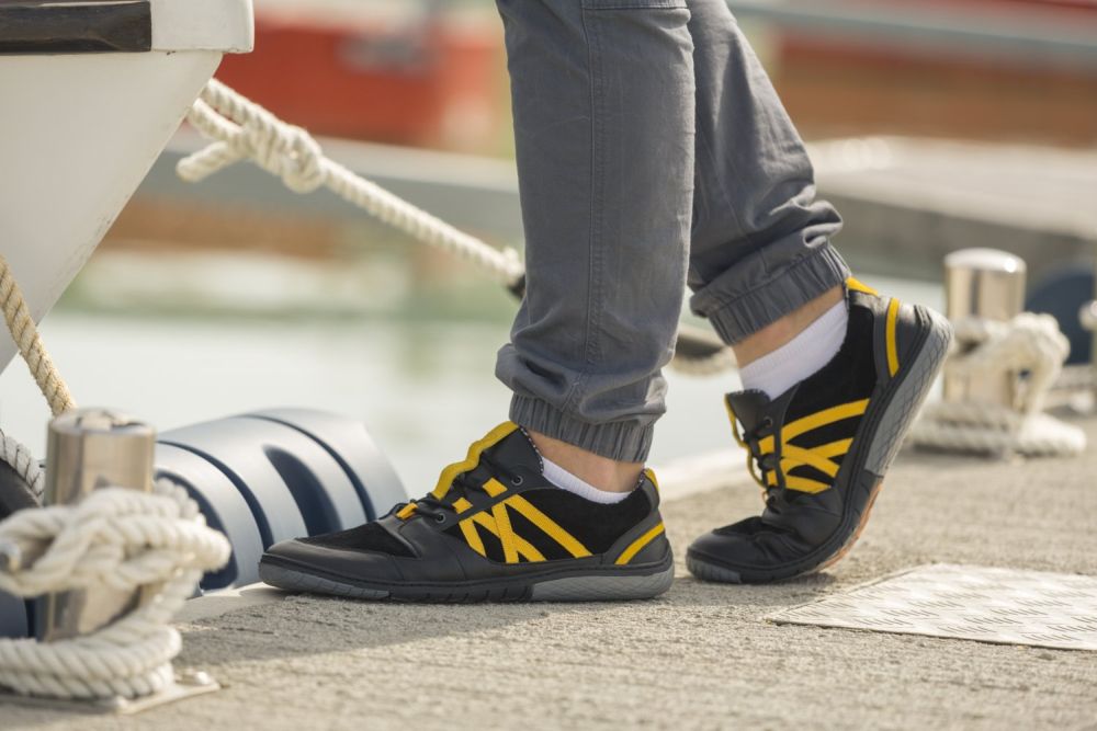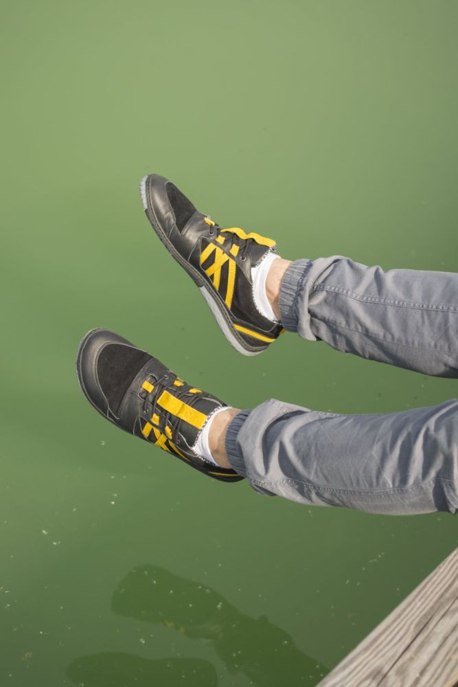 Para este zapato descalzo, hemos cosido el terciopelo negro y el cuero Nappa de la más alta calidad y proporcionados con rayas amarillas brillantes. Esto crea un aspecto deportivo dinámico que se ajusta perfectamente a todos los atuendos de ocio.