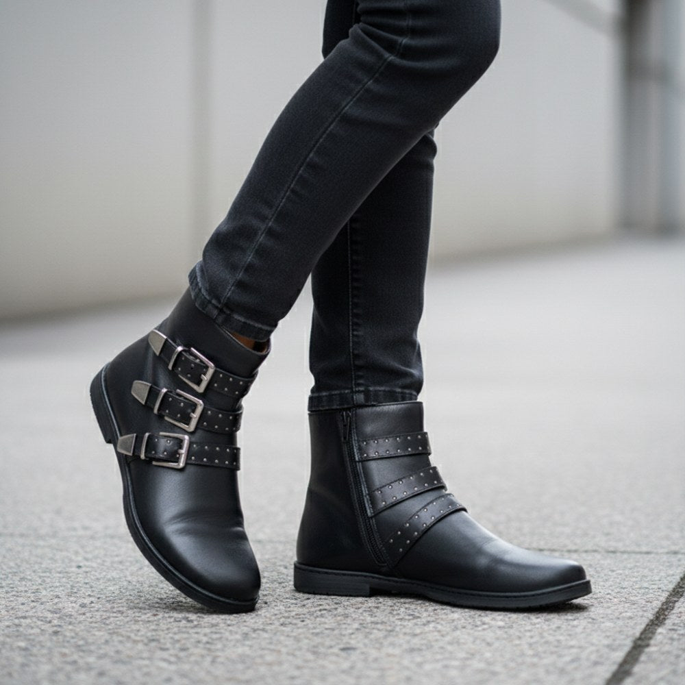Debido a las tres hebillas, este bote descalzo todavía se ve rocoso y se adapta perfectamente a los jeans casuales.