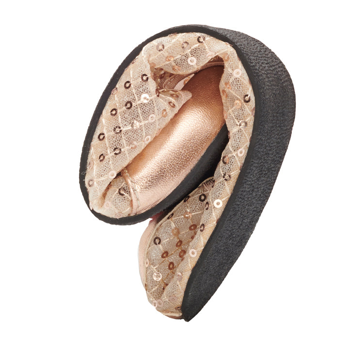 Esta bailarina estaba hecha de tela de textil suave con aplicaciones con color dorado. En la parte superior y en el talón, se cosen piezas de cuero nappa dorado para dar la estabilidad de la zapatilla descalzo. La suela es maravillosamente flexible y le brinda la mayor comodidad con cada paso. También se puede enrollar para que pueda almacenar fácilmente torcerse en su bolso.