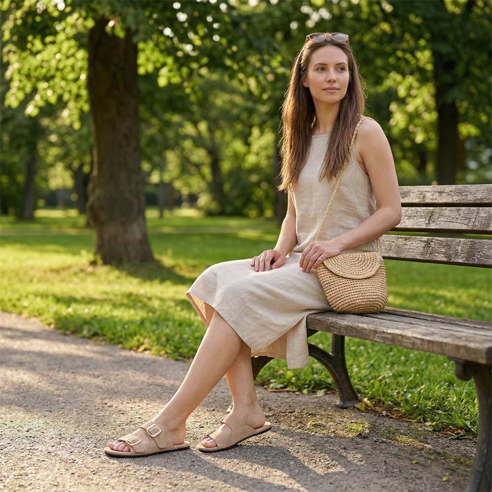 Nuestras sandalias UQO Taupe combinan lo mejor de dos mundos: los beneficios para la salud de los zapatos descalzos y un diseño que establece acentos de moda.